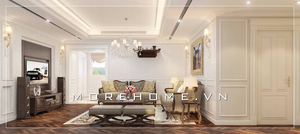 Ấn tượng với vẻ đẹp sang trọng, tinh tế từ mẫu sofa tân cổ điển nghệ thuật từ phần khung gỗ óc chó nâu cao cấp giữa phòng khách căn hộ chung cư.