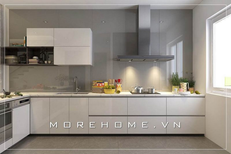 Mẫu tủ bếp gỗ công nghiệp acrylic màu trắng hiện đại, đơn giản và tiện nghi cho phòng bếp