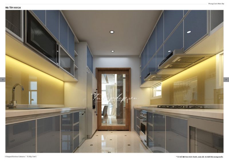 Mang vẻ đẹp sáng bóng với chất liệu acrylic sơn màu xanh biển mát mắt cho không gian bếp thêm thẩm mỹ và dễ dàng vệ sinh